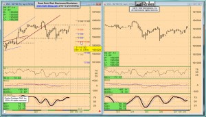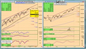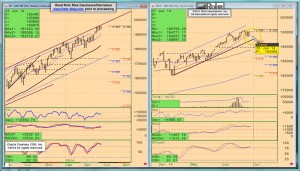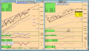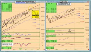 Even with the mixed international and weakish US economic data Tuesday morning, the US equities felt it was time to violate near term topping activity (more on that below) to put in another upside extension. This was likely at least partially the flows that we mentioned previous need to be put to work at the top of each quarter. Yet it was also likely at least some degree of the continued recent FED-phoria along with so many other central banks’ accommodative stances helping the equities. In any event, for right now that seems to have trumped any of the international geopolitical concerns or still weak economic readings out of Europe. More of the same was apparent in this morning’s lower than expected Euro-zone Producer Price Index. So even if Europe is so clearly lagging the outlier strong sister US, it appears that after the recent modest reactions the bulls are still in the driver’s seat… but to where?