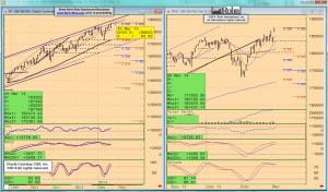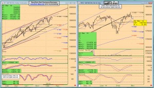 While the US equities managed to hold well in spite of the weakness in Europe late last week into Monday, the broader sense of global weakness began to take its toll yesterday into this morning. While beginning the week in a fairly neutral position, by late yesterday the June S&P 500 future weakened down to key short term up channel support in the mid-1,850 area. Even allowing slippage below it (i.e. a near term DOWN Break) might only be part of an overdue correction, the next key trend support is back into the 1,840-35 area.