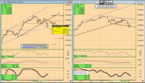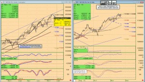 The video timeline begins with macro (i.e. fundamental influences) discussion of the degree to which the markets (especially foreign exchange) are much more focused on a revisit to our view that QE-Infinity will continue until Janet Yellen’s first meeting as Chairman in March (see Friday’s It’s the Fed PR, stupid post.) That means the equities see good news as good news and bad news as not so bad. Quite bullish for equities on balance, even if more problematic for the govvies and foreign exchange. There is also discussion of the important accelerated economic data release Wednesday into the US Thanksgiving holiday. And after we recorded the video it was announced that US Housing Starts due out at 07:30 CST will be delayed based on the US government shutdown disruption… until December 18th!!