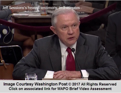 Especially note Sessions’ fiery response to Senator Wyden’s leading question from 01:30 onward. Shortly after that Sessions is pressed on why he cannot answer all concerns that even regard his private conversations with the President. You will need to access the full testimony for his extended response that there are matters Cabinet officers can withhold from Congress pending the decision by the President on whether they can be released.
