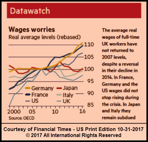 Haven’t used that one since the early 2015 accommodation-fest. Very different now with central banks having such rightful divergent agendas depending on their various country economic performance, inflation tendencies and where they are in their monetary stimulus programs along with political considerations. Yet first, consider the opening graph (we love when the FT publishes research from a credible source just as we are trying to make a related point.) Along with the research resources we have introduced to debunk outdated Phillips Curve notions (see the end of our July 20th post for Gavyn Davies’ views for one), there is the simple lack of wage growth despite sometimes impressive employment gains. And because the US has led developed economies out of post 2008-2009 Crisis weakness with the most proactive central bank, just consider the rebased wage change there since 2000.